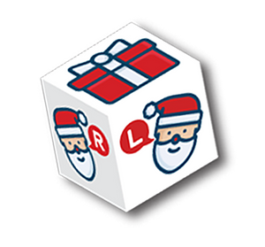 Each player takes a turn rolling the dice and passing in a clockwise direction. If the present is rolled, the player chooses a gift from the pile. If any other side is rolled, the player's turn is over and the dice is passed to their left. The round continues until each player has rolled the present and everyone has chosen a gift. -